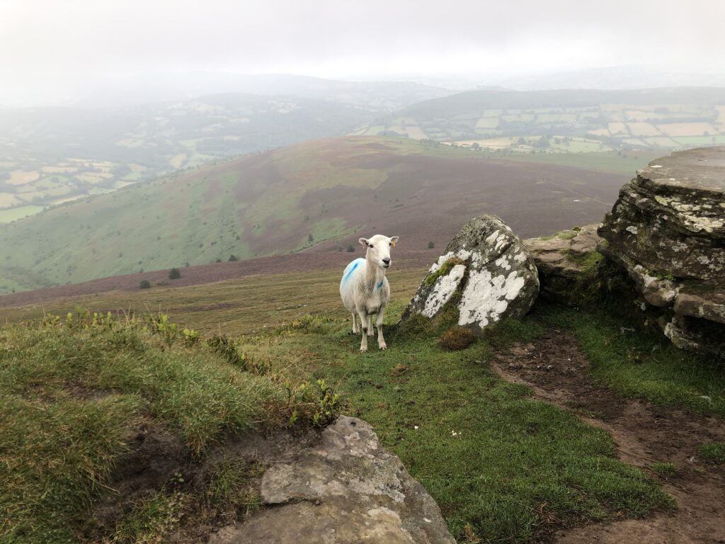 On reaching the summit we had been shrouded in mist and drizzle and the view had been largely restricted to a friendly nearby sheep!