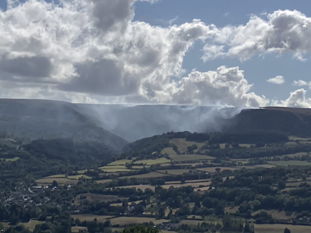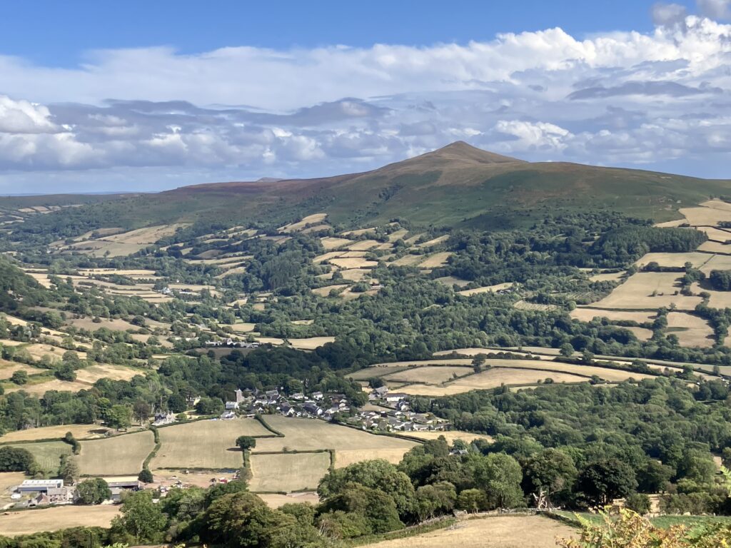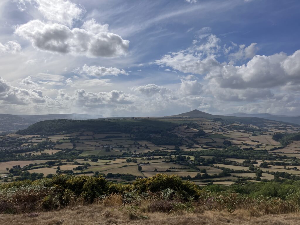 The climb up is initially quite steep, through woodland and conditions underfoot were very dusty after a dry period. However it was worth while to emerge onto the ridge with views over Wales to the west with the Brecon Beacons and the Black Mountains, and the rather less mountainous English fields to the east.