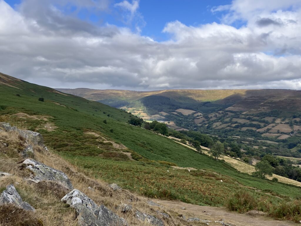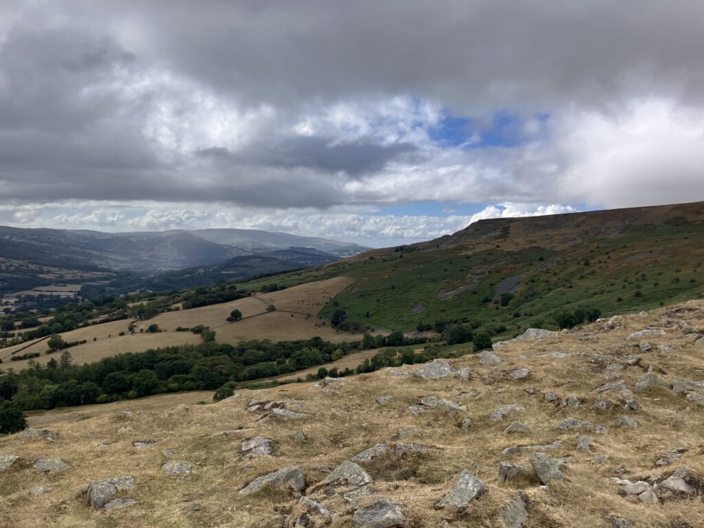 On the second day we awoke to rain and waited until it cleared to take the noon X43 bus in the direction of Brecon, getting off in Crickhowell/Crughywel, and set off up Table Mountain/Crug Hywel (altitude 451m – a climb of 373m and 6.4km). After just over 1km along a quiet road, we took the track past The Wern farm and then a delightful path, firstly between two hedgerows but then opening up to climb a grassy slope with great views back across the River Usk/Afon Wysg valley.
